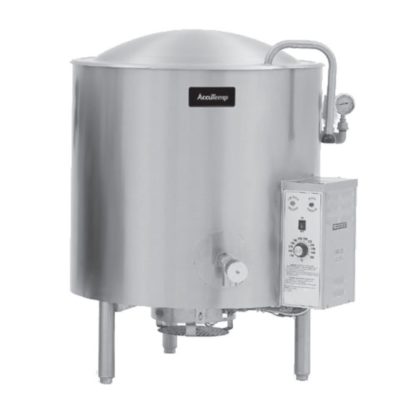 The Accutemp ALLGB-40 Edge Series stationary steam kettle equips users to prepare large quantities of soup or stew for institutions and high-volume establishments. Its compartment holds 40 gallons of product, and it has an actuator-assisted lid so users can add ingredients. A draw-off valve at the bottom enables users to remove liquid from the mixture.