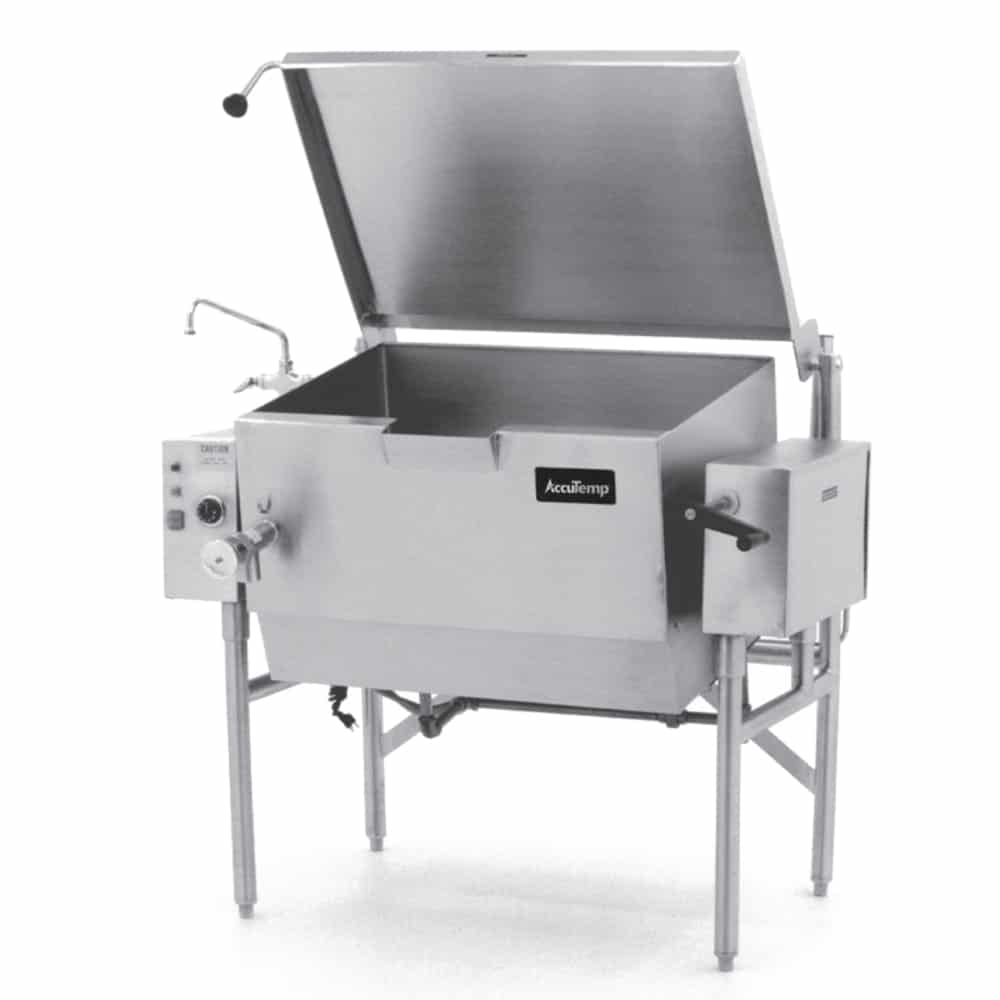 The Accutemp ALTGSE-40 NG tilt skillet is designed with an open leg base that simplifies kitchen cleaning without blocking access to floor surfaces. Featuring a tubular stainless steel construction, the legs and frame have adjustable bullet feet. For operator convenience, the 40-gallon braising pan tilts more than 90 degrees and the pour lip is centered, while a side safety handle and self-locking worm gear tilt mechanism design ensure safe and controlled pouring of hot food or grease. This tilting pan is suitable for large batch cooking and preparation in high volume venues, and the versatile braising pan and lid design can be used to grill, steam, fry, braise, and more. To withstand frequent, heavy use, this skillet is constructed of sturdy 304 stainless steel.