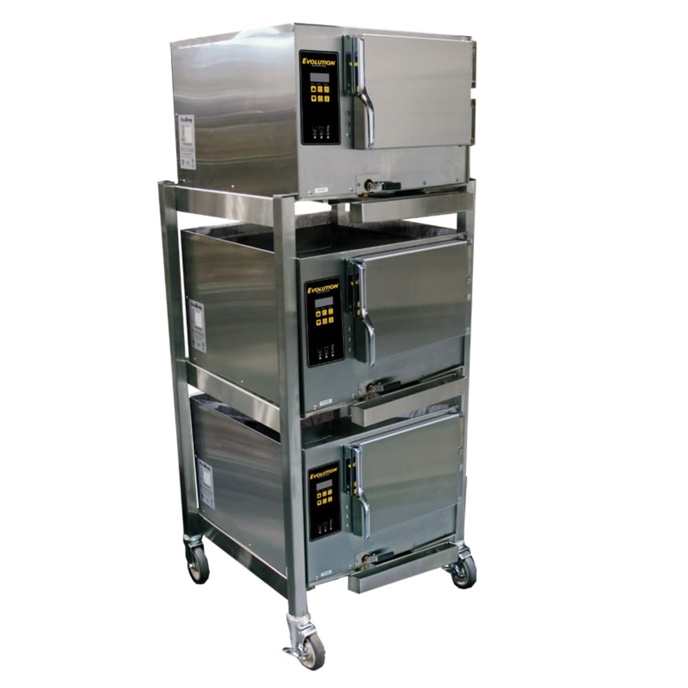 Three Connected Evolution Boilerless, Convection Steamers featuring Steam Vector Technology, electric, holds (3) 12″ x 20″ x 2-1/2″ deep pans each compartment, Digital Controls, water and drain connection needs plumbed, warranty NOT voided by water quality, NO water filtration required, 10.7kw, 240/60/3ph, (3) 5′ cords & NEMA L15-30P, cULus, UL EPH Classified, ENERGY STAR (Includes stand in configuration of choice)