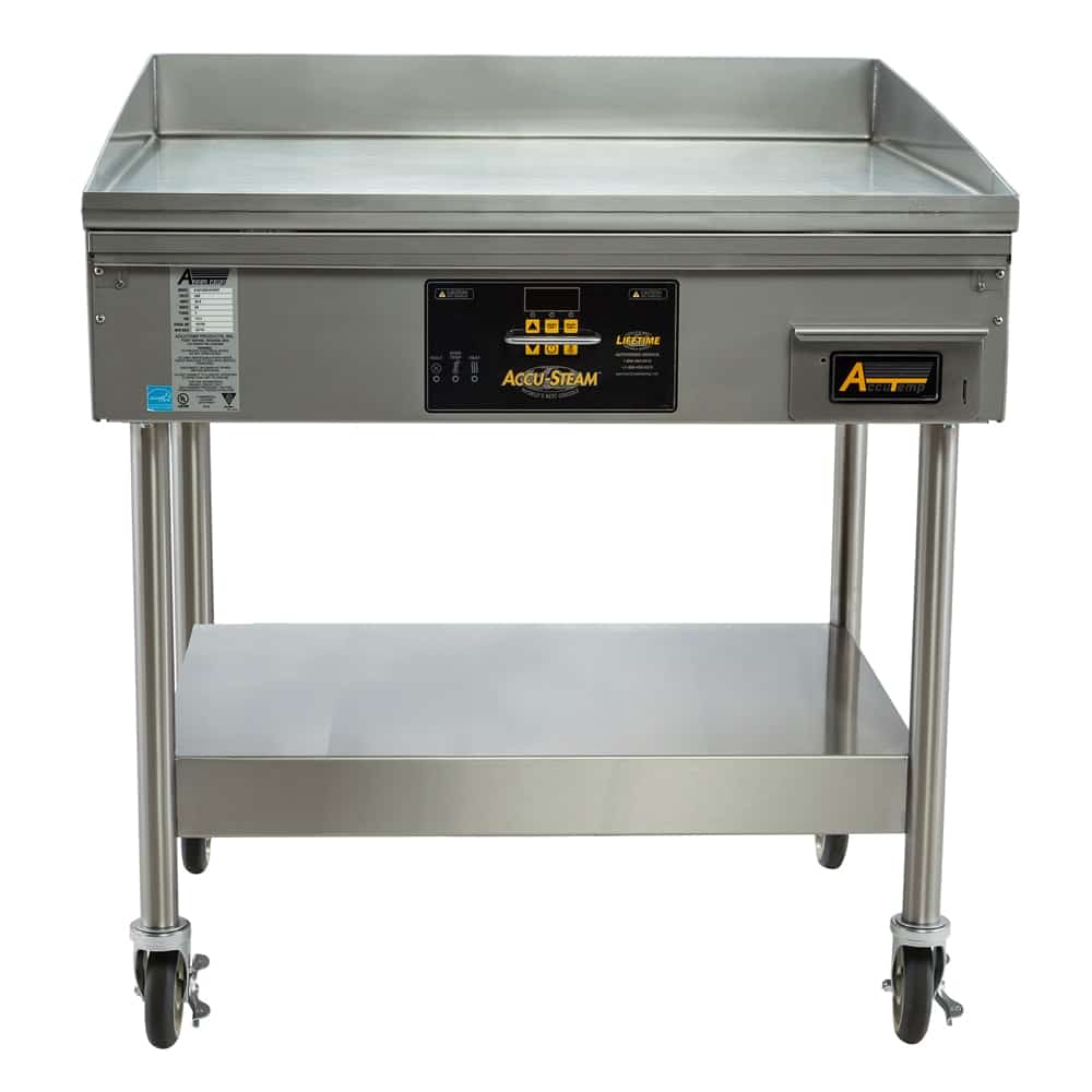 Accu-Steam Griddle, includes stand with casters, electric, 48″ x 30″ griddle area, 7 ga. 304 stainless steel cooking surface, digital thermostat and controls, 4″ grease trough, 14 ga. stainless steel cabinet, 208v/60/3-ph, 14.25kW, 40 amps, 5′ cord & NEMA 15-50P, cULus, UL EPH, ENERGY STAR, Made in USA