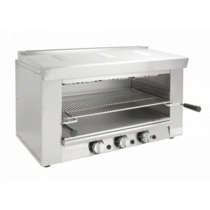 Black Diamond’s heavy duty infrared gas Cheesemelter is perfect for quickly melting cheese, heating up chips, browning the tops of casseroles and finishing sandwiches. This three burner gas powered infrared unit has adjustable gas valves and standing pilot lights for instant ignition. Constructed of heavy duty stainless steel both inside and out. The one piece broiler rack easily and safely slides in and out of the four slot racking system. A stainless steel removable crumb tray makes for easy clean-up. Overall dimensions are 21″D x 35″W x 23″H. Melting chamber dimensions are 17″D x 26.5″W x 10″H. 36,000 total BTU’s. 1 year warranty on parts and labor. ETL Listed and ETL Sanitation. Optional 4″ high stainless steel legs available.