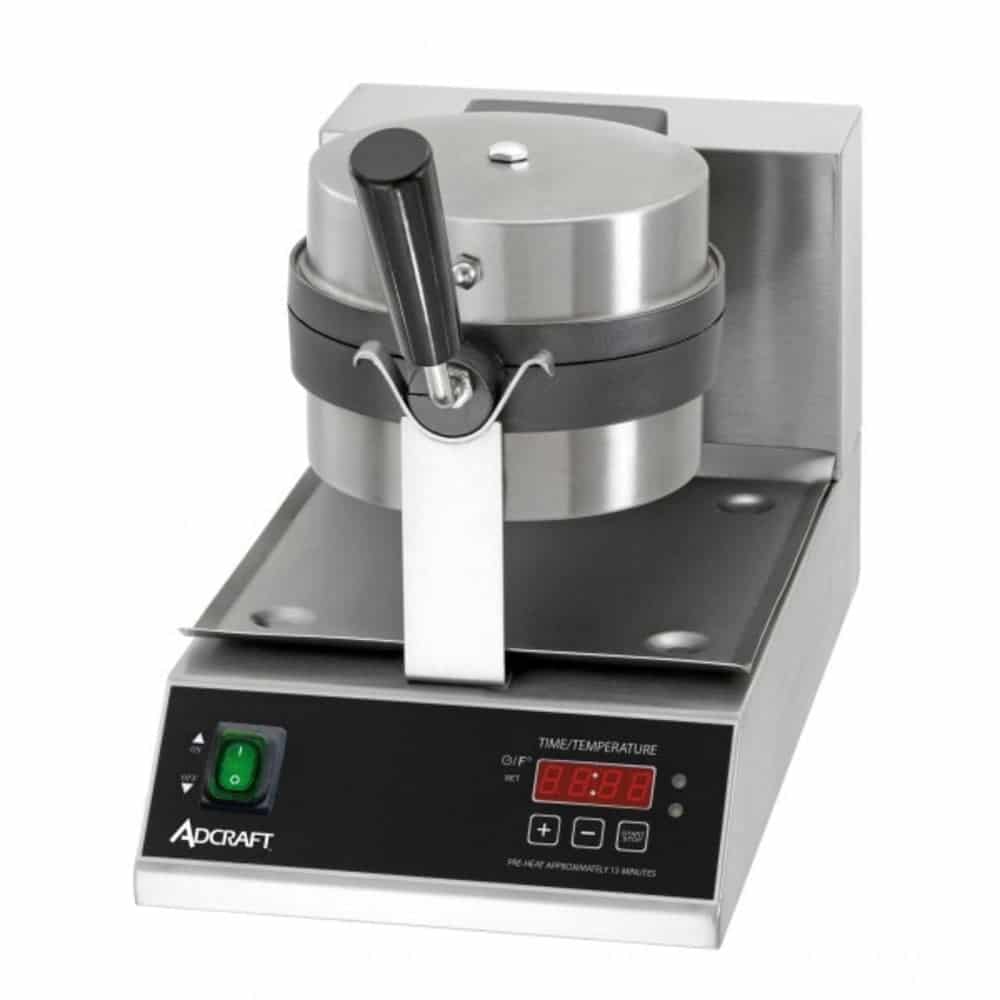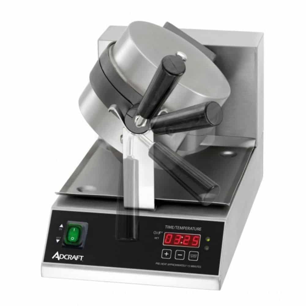 The Adcraft BWM-7/R Belgian waffle maker cooks 20 waffles per hour at temperatures adjustable from 250 to 425 degrees Fahrenheit. It includes a digital timer that buzzes when time runs out, preventing waffles from burning. When it is time to remove a waffle, the handle on the lid will be cool to the touch and the lid can be opened 180 degrees for optimal access. To facilitate cleaning, this waffle maker comes with a drip pan that catches excess food particles and is removable for emptying. Waffle batter will not stick to the grids because they are made of coated cast aluminum, ensuring a perfectly round waffle every time.