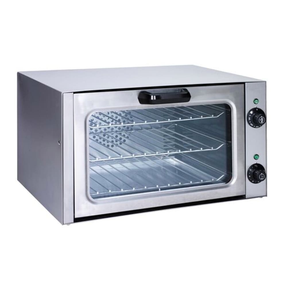 Controlled with manual knobs, the Adcraft COQ-1750W quarter-size countertop convection oven cooks food at temperatures between 120 and 480 degrees Fahrenheit. It has three shelves with 3.5 inches of space between each shelf for storing food pans. With the double-wall glass door, users can view food as it cooks to ensure perfect results. This stainless steel countertop unit is durable and expedites cleaning.