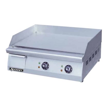 Measuring 24 inches wide by 19.75 inches deep by 10 inches high, the Adcraft GRID-24 electric griddle is designed for countertop placement. Its cooking area measures 15.5 inches wide by 16 inches deep, so a variety of menu items can be prepared, its temperature can be set from 120 to 570 degrees Fahrenheit. To protect nearby equipment and walls from grease splatter, it’s built with 3-inch-high back and side splashes.