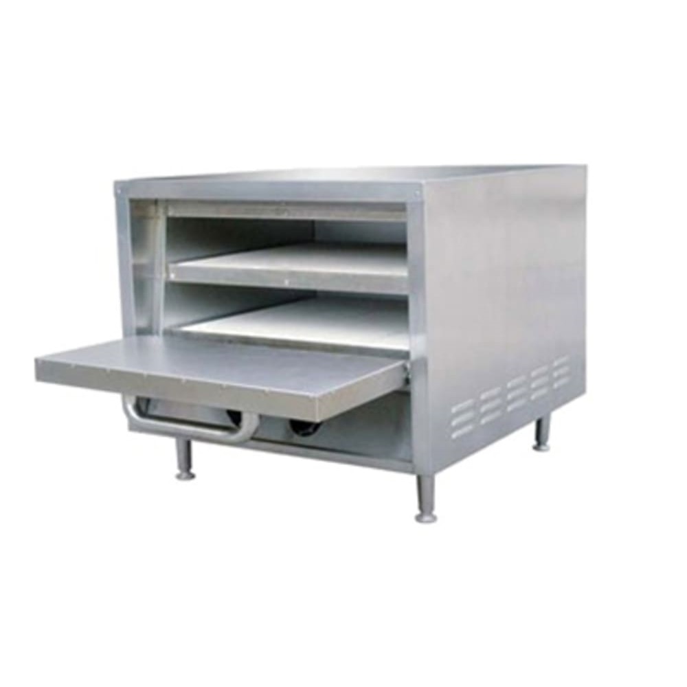 Pizza Oven, 23″W x 25″D x 21″H, stackable, 2 removable ceramic hearth baking shelves with 3-1/4″ deck height, 18″ deck width, 15 minute continuous timer, 284F to 680F temperature range, stainless steel, 6 ft. power cord, 2850 watt, 12 amps, NEMA 6-20P, CE, NSF, 240v/60/1ph