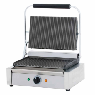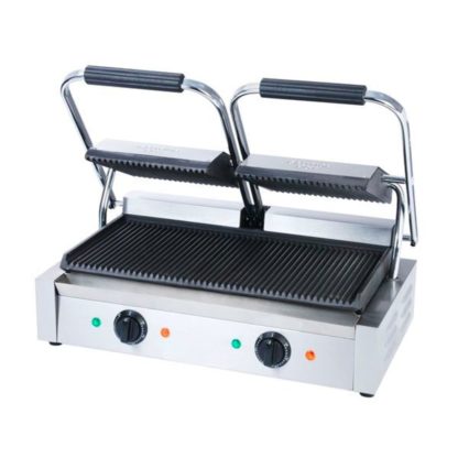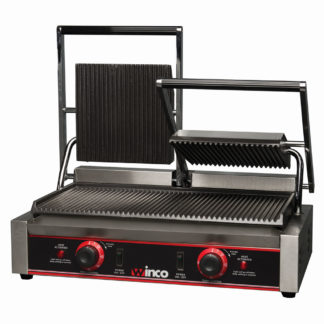 Sandwich Grill, double, countertop, electric, 19″ x 9-1/4″ grill surface, cast iron grooved plates, adjustable thermostat control switch 120°F to 570°F, includes oil tray & cleaning brush, stainless steel, 120v/60/1-ph, 1750 watts, 14.5 amps, NEMA 5-15P, NSF, CE