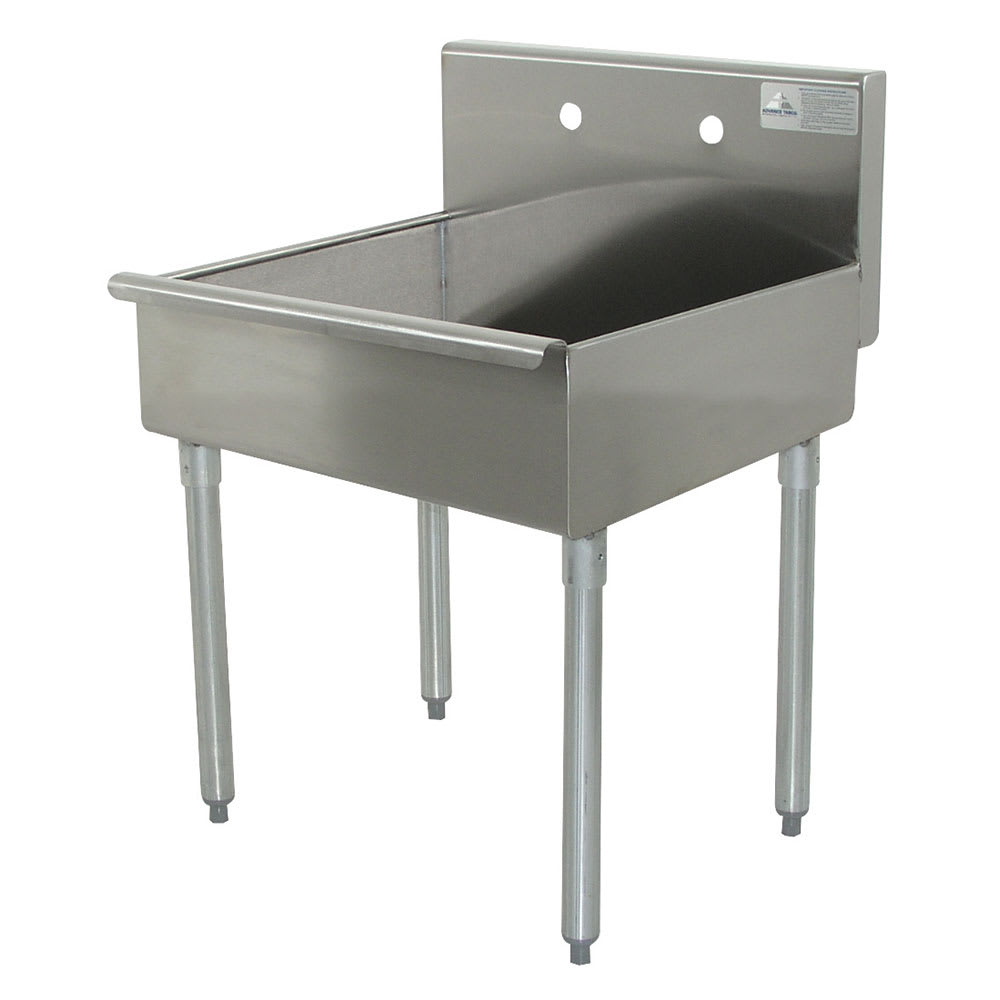 Service Sink, 1-compartment, 24″W x 24-1/2″D x 35″H O.A. 24″W x 21″D front-to-back x 8″ deep sink bowl, fabricated sink bowl, 8″H backsplash, 18/304 stainless steel construction, 8″ O.C. faucet holes, includes: 3-1/2″ basket drain, 18/430 stainless steel legs with stainless steel adjustable bullet feet