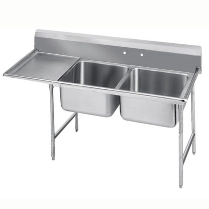 Regaline Sink, 2-compartment, with left-hand drainboard, 20″ front-to-back x 20″ wide sink compartments, 12″ deep, with 8″ high splash, stainless steel open frame base, side crossrails, 24″ drainboard, 1″ adjustable bullet feet, 18 gauge 304 series stainless steel, overall 27″ F/B x 72″ L/R, NSF