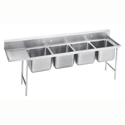 Regaline Sink, 4-compartment, with left-hand drainboard, 24″ front-to-back x 18″ wide sink compartments, 12″ deep, with 8″ high splash, stainless steel open frame base, side crossrails, 36″ drainboard, 1″ adjustable feet, 18 gauge 304 series stainless steel, overall 31″ F/B x 121″ L/R NSF (requires 2 faucets)
