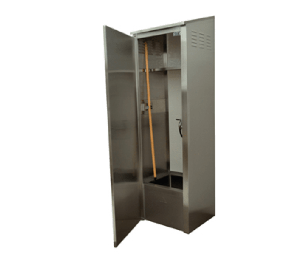 Cabinet with Mop Sink, 25-3/16″W x 22-3/4″D x 84″H, mop sink base with drain (bowl 16″ x 20″ x 12″), left hinged door, (2) mop holders, (1) fixed intermediate shelf, slotted side panels for ventilation, 16/304 series stainless steel sink bowl, 18/304 series stainless steel sink bowl apron, 18/430 series stainless steel cabinet, NSF (right hinged door available on request)