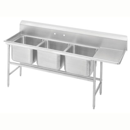 Regaline Sink, 3-compartment, with right-hand drainboard, 24″ front-to-back x 18″ wide sink compartments, 14″ deep, with 11″ high splash, stainless steel legs with welded front-to-rear & adjustable left-to-right cross rails, 36″ drainboard, 1″ adjustable bullet feet, 14 gauge 304 series stainless steel, overall 31″ F/B x 101″ L/R, NSF