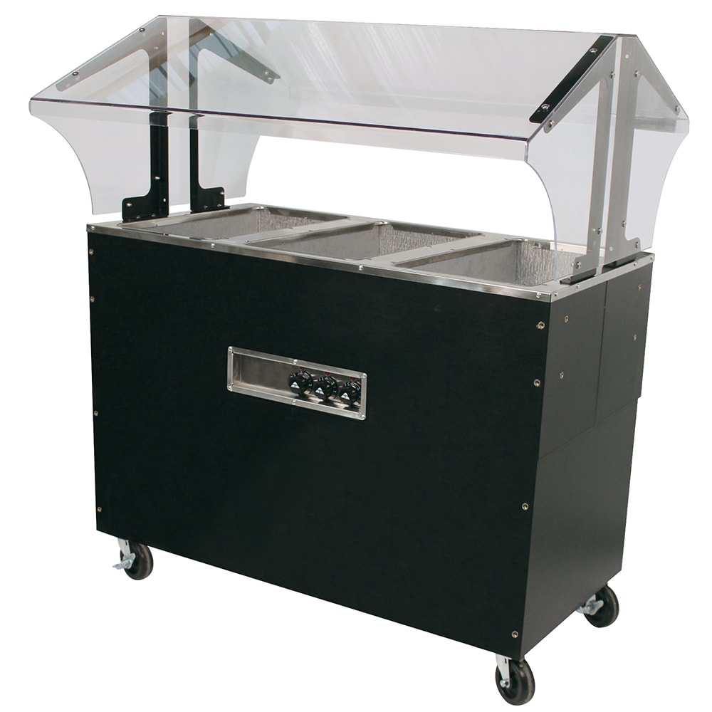 Triumph Portable Hot Food Buffet Table, electric, (3) 12″ x 20″ stainless steel hot food wells, stainless steel tray shelf, infinite controls, Lexan sneeze guard, solid base, 5″ swivel casters with 2 brakes, 6′ cord, 1PH, 120V, black vinyl clad finish, NS