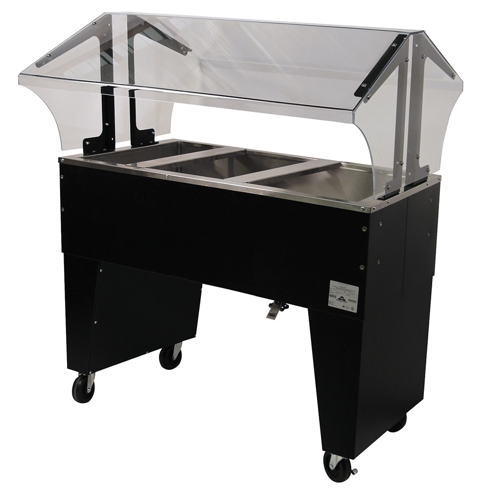 The Advance Tabco B3-CPU-B mobile food table has a black vinyl finish that conceals stains and improves the table’s appearance. A sneeze guard sits above the pans and shields them from coughs or sneezes, reducing the risk of contamination. This sneeze guard is clear to give diners an unobstructed preview of the food being served.