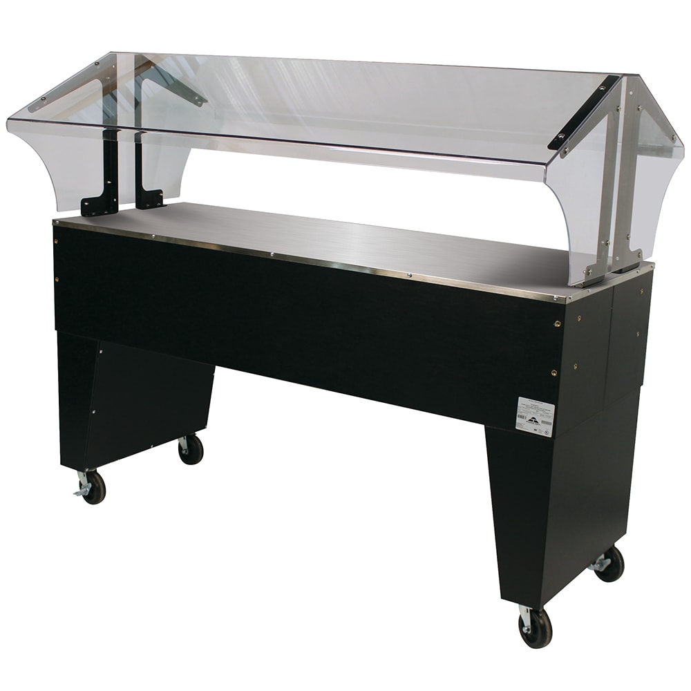Portable Solid Top Buffet Table, 62-7/16″W x 35″D x 53″H, (4) pan size, 20 gauge stainless steel solid top, double sided sneeze guard, black vinyl clad open base, 4″ swivel casters ( 2 ) braked, NSF