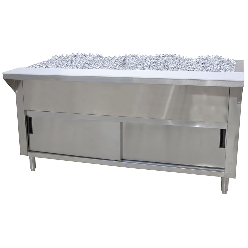 Ice Cooled Serving Counter, 47-1/8″W x 30-5/8″D x 34-3/8″H, accommodates (3) 12″ x 20″ pans inserts up to 6-1/4″ deep (with additional space below for ice), stainless steel shelf with removable 8″ x 3/8″ thick poly cutting board, 1″ drain, 22/430 stainless steel top, stainless steel enclosed base with (2) sliding doors & 18 gauge stainless steel fixed undershelf, adjustable plastic bullet feet, NSF