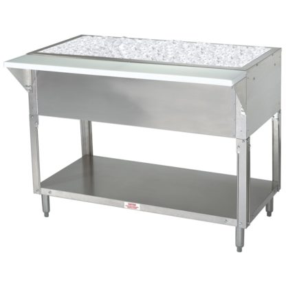 To provide stability on uneven floors, the Advance Tabco CPU-4 cold food bar is equipped with galvanized steel legs and plastic bullet feet. It’s insulated with fiberglass to slow the melting of ice, and it accommodates four food pans as deep as 61/4 inches. A 1-inch IPS drain facilitates cleaning by simplifying water removal when ice melts. Its adjustable, galvanized undershelf can be used to store items, and a removable cutting board offers space for employees to prep and chop ingredients.
