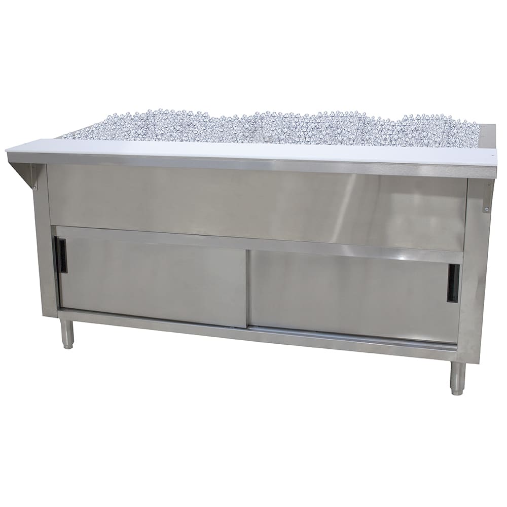 Ice Cooled Serving Counter, 62-7/16″W x 30-5/8″D x 34-3/8″H, accommodates (4) 12″ x 20″ pans inserts up to 6-1/4″ deep (with additional space below for ice), stainless steel shelf with removable 8″ x 3/8″ thick poly cutting board, 1″ drain, 22/430 stainless steel top, stainless steel enclosed base with (2) sliding doors & 18 gauge stainless steel fixed undershelf, adjustable plastic bullet feet, NSF