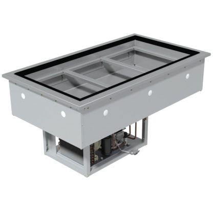 Refrigerated Cold Pan, Drop-in, 25.5″ x 45.625″ cut out, holds (3) 12″ x 20″ pans, stainless steel top, fully self contained condensing unit (22.625″ x 22.625″ x 13.21″), digital programmable thermostat, aluminum encased copper tube evaporator panels, expansion valve, NEMA 5-15P, 115V/60Hz/1-ph, 8A, 1/4 HP, R404-A, 1500 btu