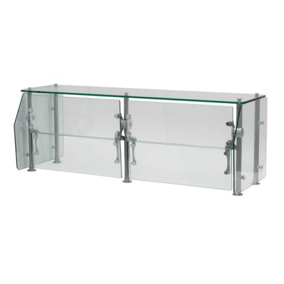 Sleek Shield Food Shield, multi-use (self-service or cafeteria style) (Patent Pending), 48″W x 12″D x 18″H, with glass top shelf, 3/8″ thick heat tempered glass front & 1/4″ thick side panels (side panels 18″ deep to meet NSF requirements), 3/8″ thick heat tempered top glass, equipped with Chamber Lock technology fixed to upright legs, allowing rotation in 15 degree intervals, maximum load on top glass 100 pounds evenly distributed weight