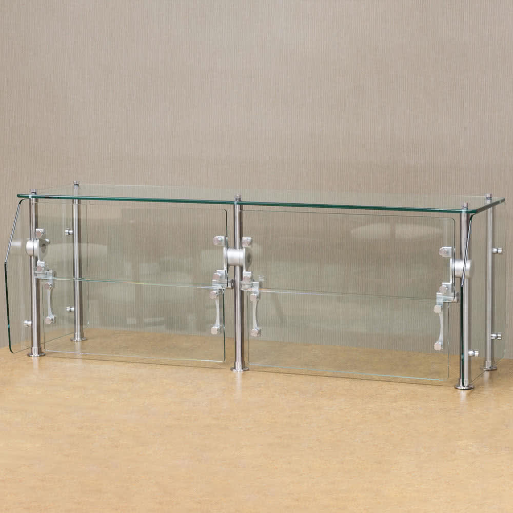 Sleek Shield Food Shield, multi-use (self-service or cafeteria style) (Patent Pending), 120″W x 18″D x 18″H, with glass top shelf, 3/8″ thick heat tempered glass front & 1/4″ thick side panels (side panels 18″ deep to meet NSF requirements), 3/8″ thick heat tempered top glass, equipped with Chamber Lock technology fixed to upright legs, allowing rotation in 15 degree intervals, maximum load on top glass 100 pounds evenly distributed weight, includes: (2) additional center support posts