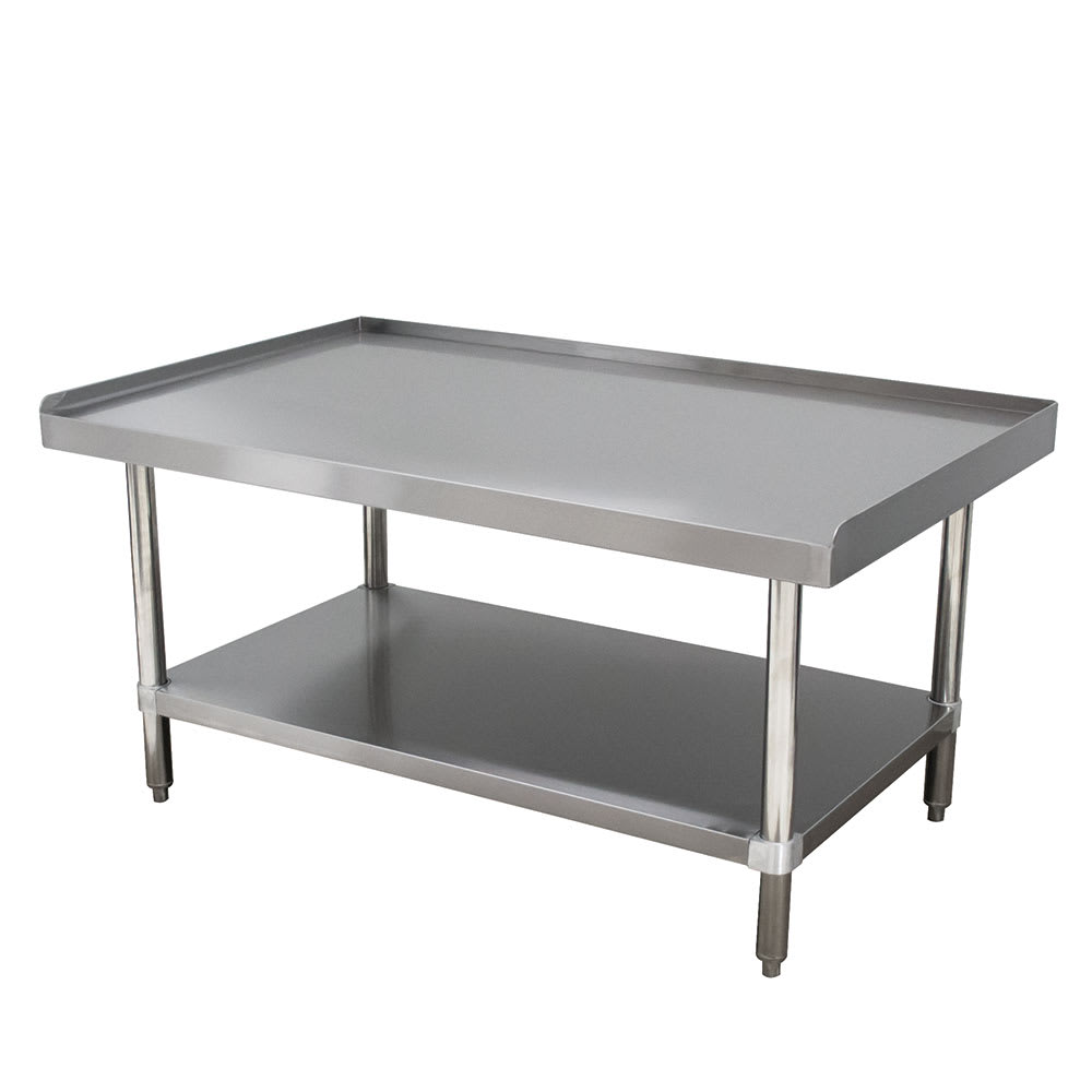 Equipment Stand, 96″W x 24″D x 25″H (overall), 24″ working height, 14 gauge 304 series stainless steel top with 1″ upturn on rear & both sides, front edge with no-drip v-edge, 18 gauge adjustable stainless steel undershelf, stainless steel legs with adjustable stainless steel bullet feet, NSF