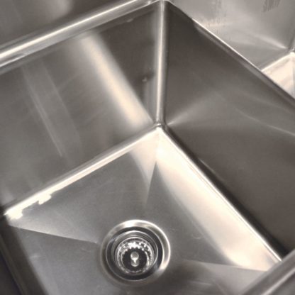 Special Value Fabricated Sink, 3-compartment, 15″ right & left drainboards, bowl size 10″ x 14″ x 10″ deep, 18 gauge 304 stainless steel, tile edge splash, rolled edge, 8″ OC faucet holes, galvanized legs with 1″ adjustable plastic bullet feet, overall 19-3/4″ F/B x 60″ L/R, NSF