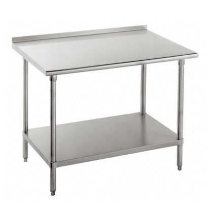Work Table, 84″W x 24″D, 16 gauge 304 series stainless steel top with 1-1/2″ rear upturn, 18 gauge adjustable galvanized undershelf, galvanized legs with adjustable plastic bullet feet, NSF