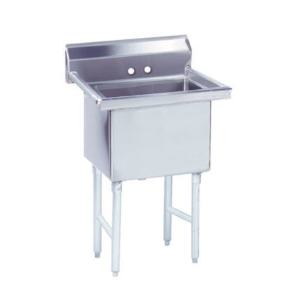 Fabricated Sink, 1-compartment, no drainboards, bowl size 18″ x 18″ x 14″ deep, 14 gauge 304 stainless steel, tile edge splash, rolled edge, 8″ OC faucet holes, stainless steel legs with 1″ adjustable stainless steel bullet feet, overall 23-1/2″ F/B x 23″ L/R, NSF