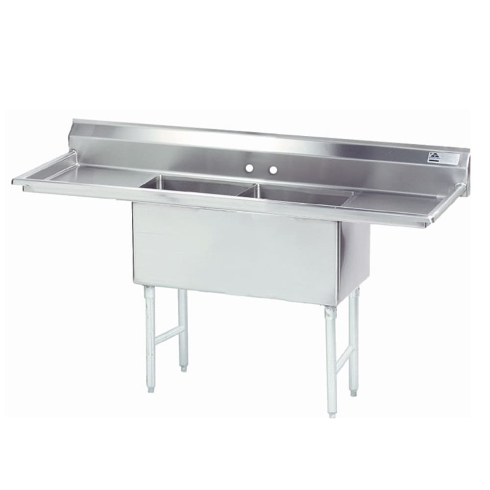 Fabricated Sink, 2-compartment, 18″ right & left drainboards, bowl size 18″ x 24″ x 14″ deep, 14 gauge 304 stainless steel, tile edge splash, rolled edge, 8″ OC faucet holes, stainless steel legs with 1″ adjustable stainless steel bullet feet, overall 29-1/2″ F/B x 72″ L/R, NSF