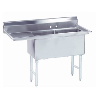 Fabricated Sink, 2-compartment, 18″ left drainboard, bowl size 24″ x 24″ x 14″ deep, 14 gauge 304 stainless steel, tile edge splash, rolled edge, 8″ OC faucet holes, stainless steel legs with 1″ adjustable stainless steel bullet feet, overall 29-1/2″ F/B x 68-1/2″ L/R, NSF