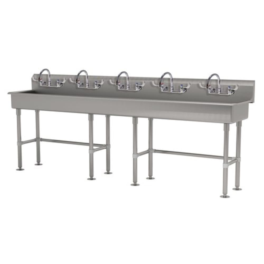 Multiwash Hand Sink, splash mount faucet provision, with stainless steel legs and flanged feet, includes (5) faucets with wrist blades, 100″W x 19-1/2″D x 42-1/2″H (overall), 16″ front-to-back x 5″ deep (bowl size), 8-1/2″H backsplash, punched with (5) sets of faucet holes 8″ OC, includes 3-1/2″ rear basket drain, 14 gauge 304 stainless steel construction, NSF, ADA compliant