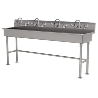 Multiwash Hand Sink, splash mount faucet provision, with stainless steel legs and flanged feet, includes (4) faucets with wrist blades, 80″W x 19-1/2″D x 42-1/2″H (overall), 16″ front-to-back x 5″ deep (bowl size), 8-1/2″H backsplash, punched with (4) sets of faucet holes 8″ OC, includes 3-1/2″ rear basket drain, 14 gauge 304 stainless steel construction, NSF, ADA compliant