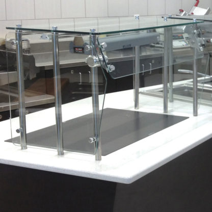 Sleek Food Shield, self service, 12″ x 84″, 18″ tall with Glass top shelf, 1/4″ heat tempered glass front & side panels (side panels 18″ deep to meet NSF requirements), 3/8″ heat tempered Glass top, equipped with Chamber Lock technology fixed to upright legs, allowing rotation in 15 degree intervals, maximum load on top glass 100 pounds evenly distributed weight (Sleek shield patent pending)