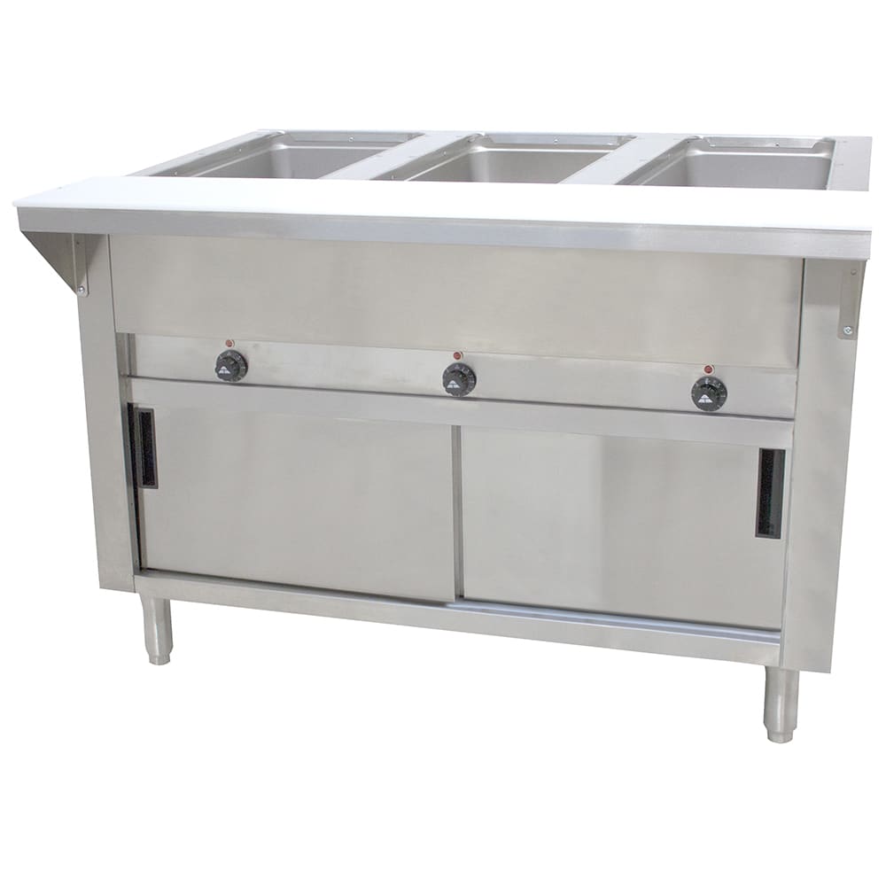 Triumph Hot Food Table, electric, 34″ H, 47.125″ long, (3) 12″ x 20″ hot food wells with infinite controls, stainless steel top, 8″ x 1″ thick poly cutting board, stainless steel cabinet base with sliding doors, 6′ cord & plug, 1500w, 120V/60/1