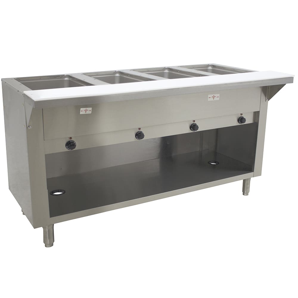 Triumph Hot Food Table, 34″ H, electric, 62.375″ long, (4) 12″ x 20″ hot food wells with infinite controls, stainless steel top, 8″ x 1″ thick poly cutting board, stainless steel cabinet base with open undershelf, 6′ cord & plug, 2000w, 120V/60/1