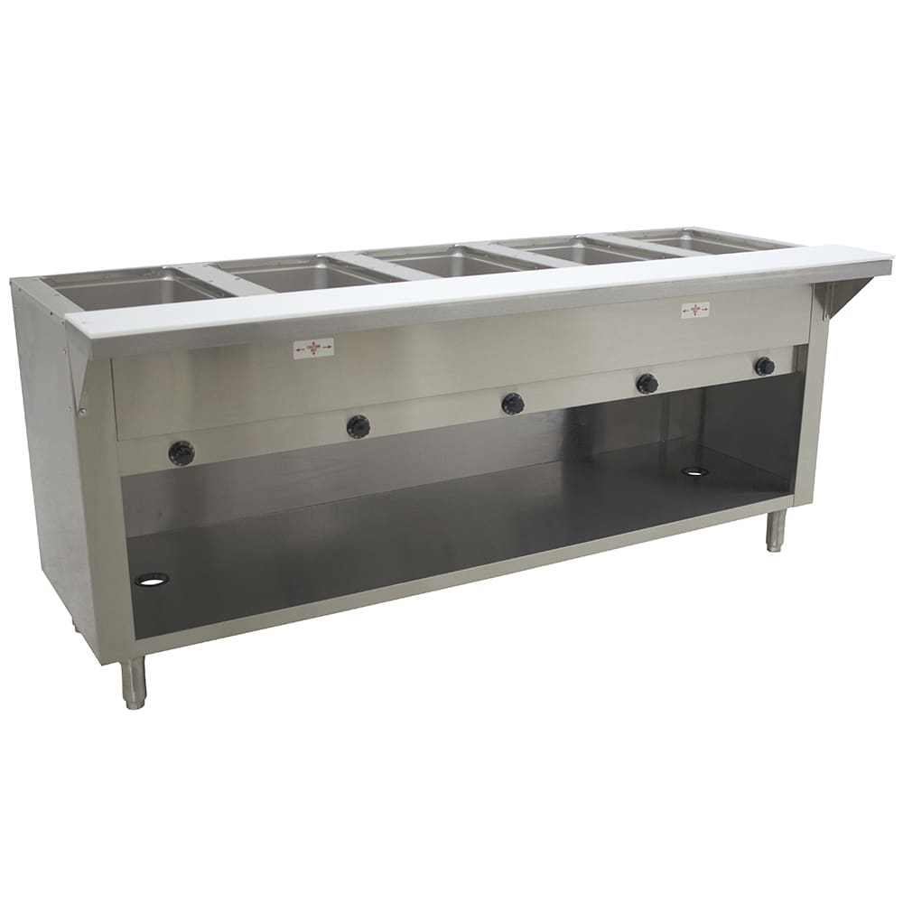 Triumph Hot Food Table, 34″ H, 77.750″ long, (5) 12″ x 20″ hot food wells with 3-setting controls knobs, pilot indicator opening, stainless steel top, 8″ x 1″ thick poly cutting board, stainless steel cabinet base with open undershelf, 17,500 BTU, natural gas