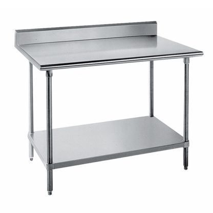 Work Table, 84″W x 24″D, 16 gauge 304 series stainless steel top with 5″H backsplash, 18 gauge galvanized adjustable undershelf, galvanized legs with adjustable plastic bullet feet, NSF