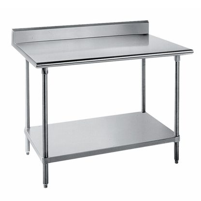 Work Table, 36″W x 36″D, 16 gauge 304 series stainless steel top with 5″H backsplash, 18 gauge stainless steel adjustable undershelf, stainless steel legs with adjustable stainless steel bullet feet, NSF