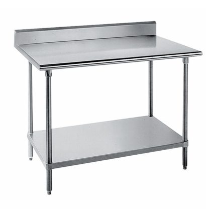 Work Table, 48″W x 36″D, 14 gauge 304 series stainless steel top with 5″H backsplash, 18 gauge stainless steel adjustable undershelf, stainless steel legs with stainless steel bullet feet, NSF