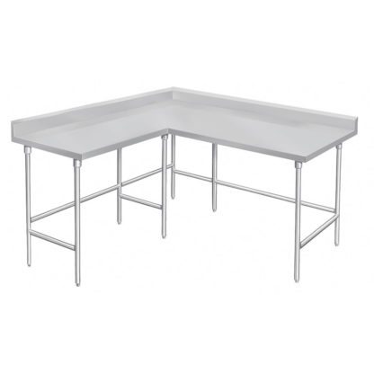 Work Table, L-shaped, 108″ (left side) x 60″, 30″ working depth, 14 gauge 304 stainless steel top with 5″H backsplash,stainless steel legs with side & rear crossrails, adjustable stainless steel bullet feet, NSF