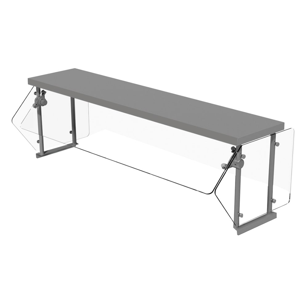 Sleek Shield Food Shield, self service with adjustable front glass, 64-5/16″W x 19-3/4″D x 18-3/4″H (with 15″ wide stainless steel top shelf), 3/8″ thick heat tempered glass front & 1/4″ side panels (side panels 19-3/4″ deep to meet NSF requirements), equipped with Chamber Lock technology fixed to upright legs, allowing rotation in 15 degree intervals for Advance Tabco (4) well hot or cold food tables) (NOTE: due to mounting requirements, this food shield extends 15/16″ beyond the end of the hot or cold food table on each end. Units set side by side must allow for this additional space)