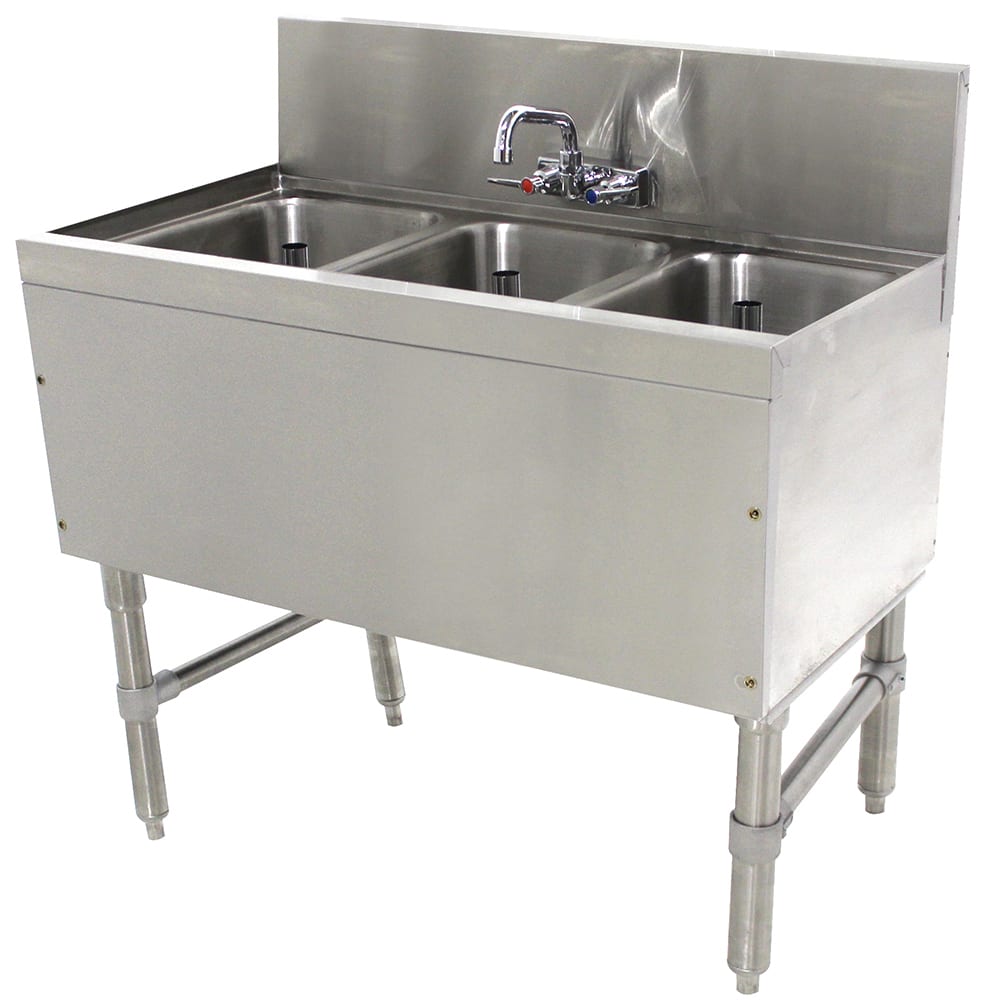 Prestige Underbar Sink Unit, 3-compartment, 36″W x 19″D x 36″H, 14″ front-to-back x 10″ left-to-right x 10″ deep sink bowls, no drainboards, 7″H backsplash, stainless steel open frame base, side crossrails, stainless steel construction, includes: (1) splash mount faucet with 12″ swivel spout, NSF