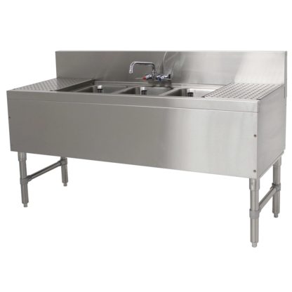 Prestige Underbar Sink Unit, 3-compartment, 60″W x 20″D x 36″H, 14″ front-to-back x 10″ left-to-right x 10″ deep sink bowls, 12″ drainboards on left & right, 7″H backsplash, stainless steel open frame base, side crossrails, stainless steel construction, includes: (1) splash mount faucet with 10″ swing spout, NSF