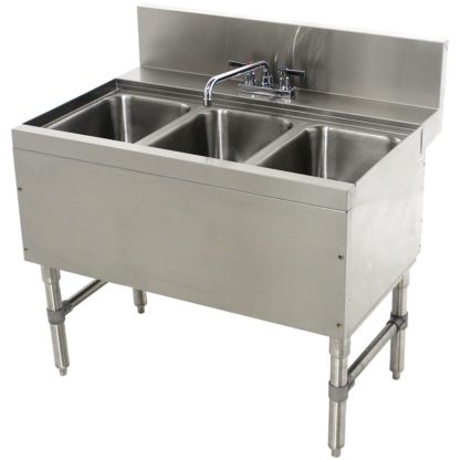 Prestige Underbar Sink Unit, 3-compartment, 36″W x 24″D x 36″H, 14″ front-to-back x 10″ left-to-right x 10″ deep sink bowls, no drainboards, 7″H backsplash, stainless steel open frame base, side crossrails, stainless steel construction, includes: (1) deck mount faucet with 12″ swivel spout, NSF