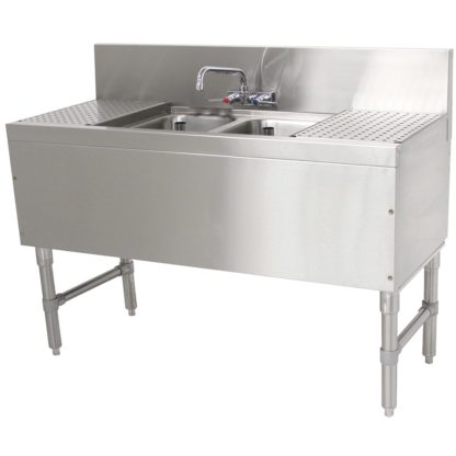 Prestige Underbar Sink Unit, 2-compartment, 48″W x 25″D x 36″H, 14″ front-to-back x 10″ left-to-right x 10″ deep sink bowls, 12″ drainboards on left & right, 7″H backsplash, stainless steel open frame base, side crossrails, stainless steel construction, includes: (1) deck mount faucet with 6″ swing spout, NSF