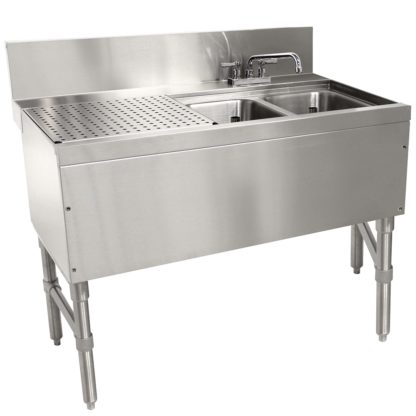 Prestige Underbar Sink Unit, 2-compartment, 48″W x 25″D x 36″H, 14″ front-to-back x 10″ left-to-right x 10″ deep sink bowls, 23″ drainboard on left, 7″H backsplash, stainless steel open frame base, side crossrails, stainless steel construction, includes: (1) deck mount faucet with 6″ swing spout, NSF