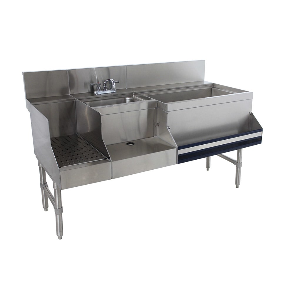 Prestige Uni-Serv Speed Bar, 60″W x 30″D x 36″H (overall), 7″ backsplash, 30″W x 11″D x 11″ deep insulated ice bin on right with 10-circuit cold plate, 89 lb ice capacity, dump sink with 3-1/2″ basket drain, 4″ splash mount faucet with swing spout, recessed drainboard with removable perforated top for glasses, blender station with recess outlet, 30″ speed rail, 1-3/4″ return with soda gun knock-out, stainless steel construction, stainless steel legs with adjustable plastic bullet feet, NSF