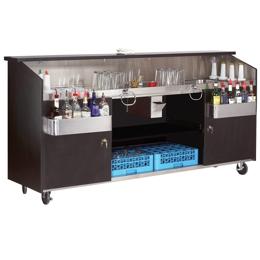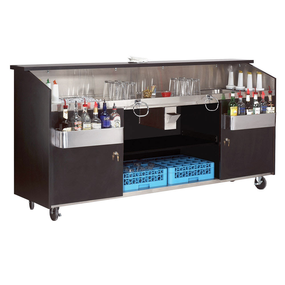 The Advance Tabco R-8-B portable bar has a stainless steel work area that resists corrosion resulting from spilled drinks and cleaning chemicals. Two ice bins chill bottles and cans, and two speed rails mounted on the left and right hold bottles of liquor. An open storage area in the unit’s bottom section accommodates glass racks.