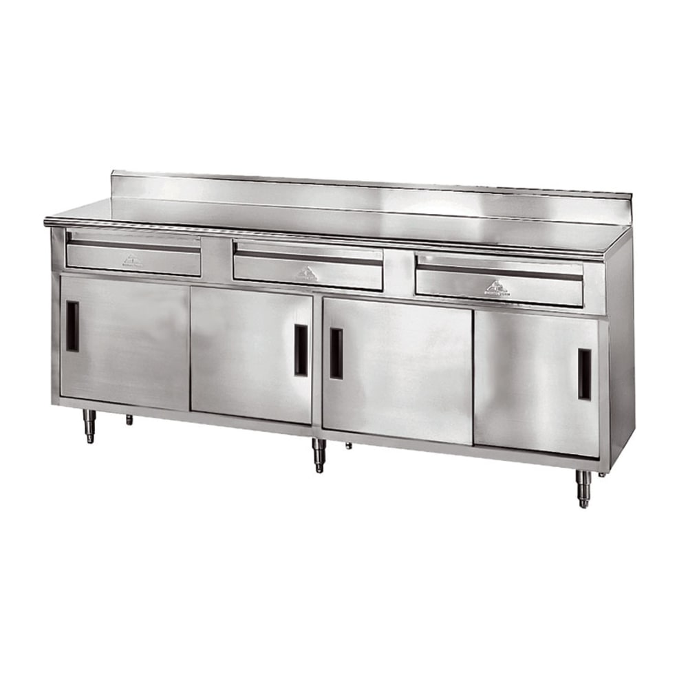 Storage Cabinet, 60″W x 30″D, 14 gauge 304 stainless steel top with 5″H backsplash, (2) fully enclosed NSF drawers, enclosed cabinet base with (2) sliding doors, stainless steel legs with adjustable hex feet