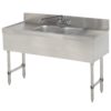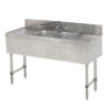 Slimline Underbar Work Board Sink Unit, with 2 sink compartments, 48″ long, 18″ wide, with 12″ right & left drainboards, 4″ splash, stainless finish with black powder coated pipe legs, with back splash mounted faucet